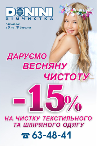 Мережа хімчисток Доніні вітає вас зі святом весни і краси та  дарує знижку -15% на чистку текстильного, шкіряного і хутряного одягу в період з 5-го по 18-те березня.